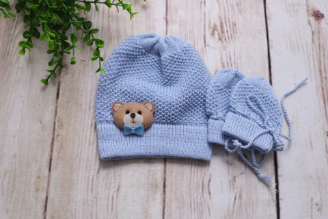 Touca e luvas de tricot 100% acrílico antialérgico.