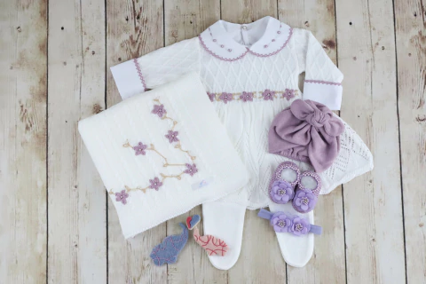 A Saída de Maternidade é o principal item do enxoval do bebê, é uma lembrança para a vida inteira. Confeccionada em tricot antialérgico, a Saída de Maternidade Ana é puro Luxo! Lindas flores, bordadas a mão, na cintura do vestido e na manta trazem um misto de delicadeza e sofisticação.