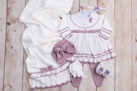 A Saída de Maternidade é o principal item do enxoval do bebê, é uma lembrança para a vida inteira. Confeccionada em tricot antialérgico, a Saída de Maternidade Mel possui delicados apliques de lacinho no vestido e na manta e detalhes vazados que dão um toque especial. Um charme!!!